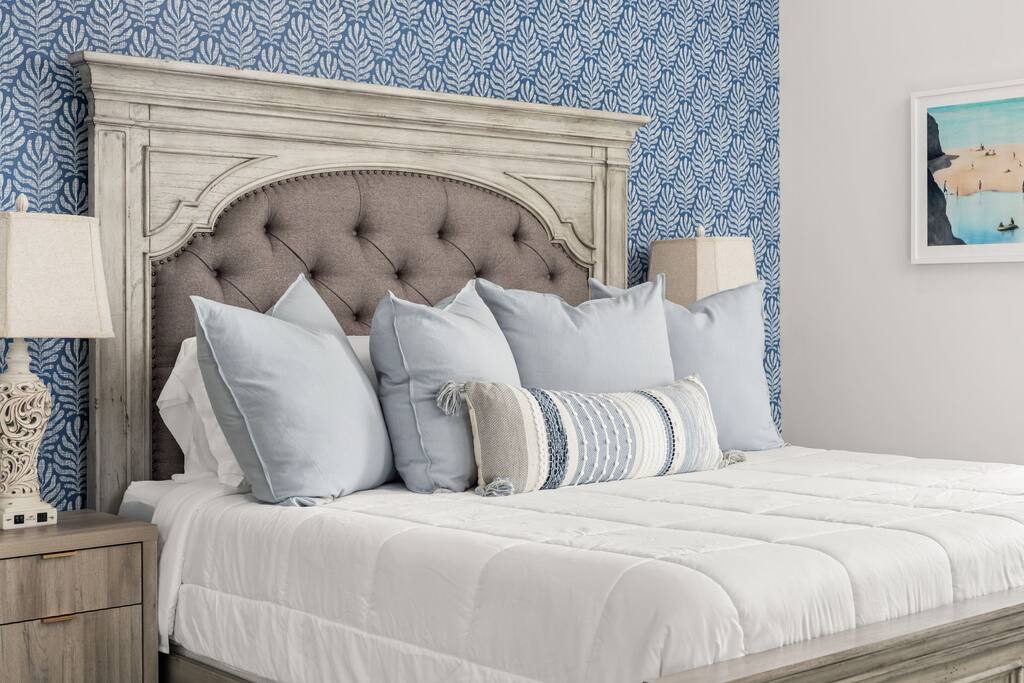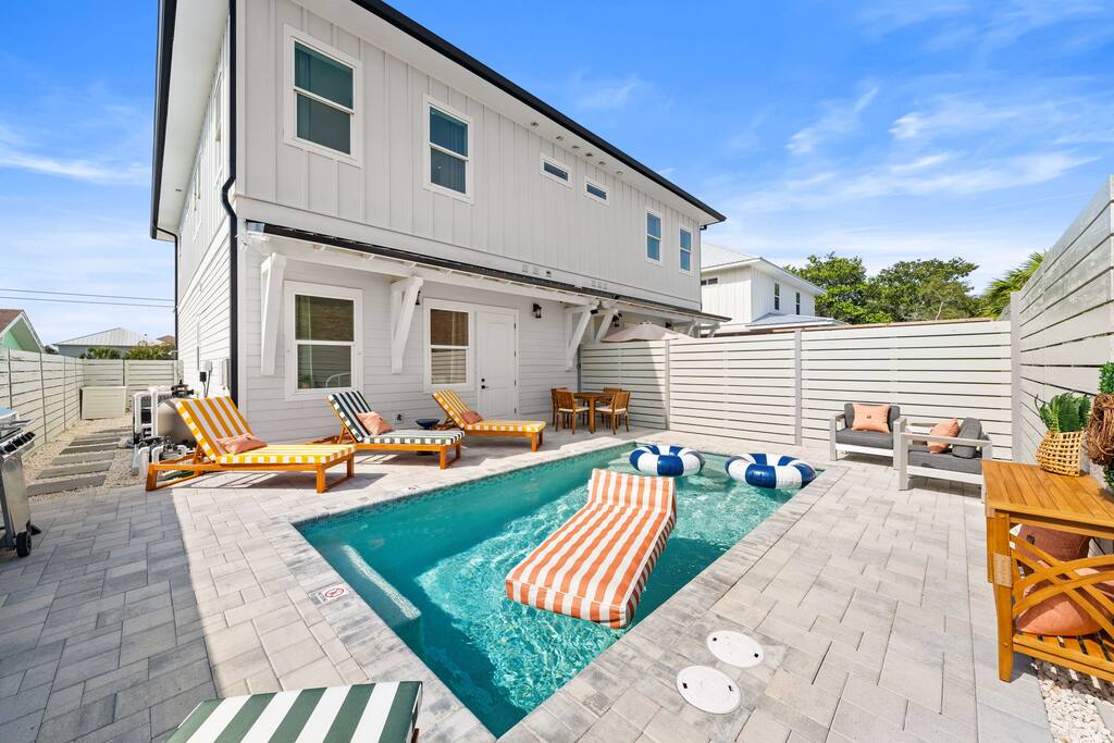 🏡 Welcome to Evergreen Shores, your private coastal retreat in Panama City Beach. Imagine waking up to Gulf views, enjoying an easy stroll to the beach without any parking hassles, and returning to your own private heated pool. Located on a quiet residential street, this home is the perfect escape for families, couples, and responsible groups seeking a tranquil beach vacation. Step inside to a bright, open layout with modern furniture and clean lines, creating a warm and inviting atmosphere. The main living area is designed for gathering, making it easy to relax together after a day in the sun. Key Amenities: Private heated pool Steps to beach Fully stocked kitchen Washer and dryer Smart TVs throughout High-speed Wi-Fi Outdoor shower Premium kitchen appliances Board games & card games Children’s books/toys Gas Grill Room-darkening shades Bedrooms & Bathrooms (Sleeps 12) Every bedroom is a comfortable sanctuary featuring quality mattresses, hotel-style linens, and a Smart TV for private entertainment. Primary Bedroom: King bed with an en-suite bathroom and a private balcony offering Gulf views. Bedroom 2: King bed with an en-suite bathroom and direct access to the pool. Bedroom 3: King bed. Bedroom 4 (Bunk Room): Queen-over-Queen bunk bed plus a Full trundle. Entertainment & Family Fun Collection of board games and card games Children’s books and toys lifesized connect 4 🍽 Kitchen The fully stocked kitchen includes cookware, dishes, and essentials for preparing meals at home. Enjoy meals together at the dining table or relax in the open living area after a beach day. A washer and dryer are available for guest use. 🌴 Outdoor Oasis Your fully fenced private heated pool awaits. Refreshing morning swims or a relaxing evening dip. Soak up the sun in one of the comfortable pool side loungers. An outdoor shower makes rinsing off after the beach a breeze.